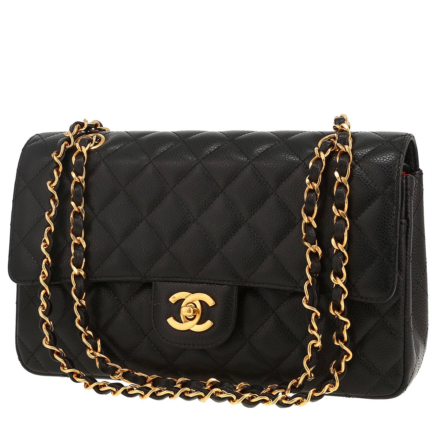 Magnífico bolso de mano Chanel Timeless Classic de cuero granulado acolchado negro, adorno en metal dorado, una asa en cadena ajustable de metal dorado entrelazada de cuero negro para llevar en la mano o al hombro.