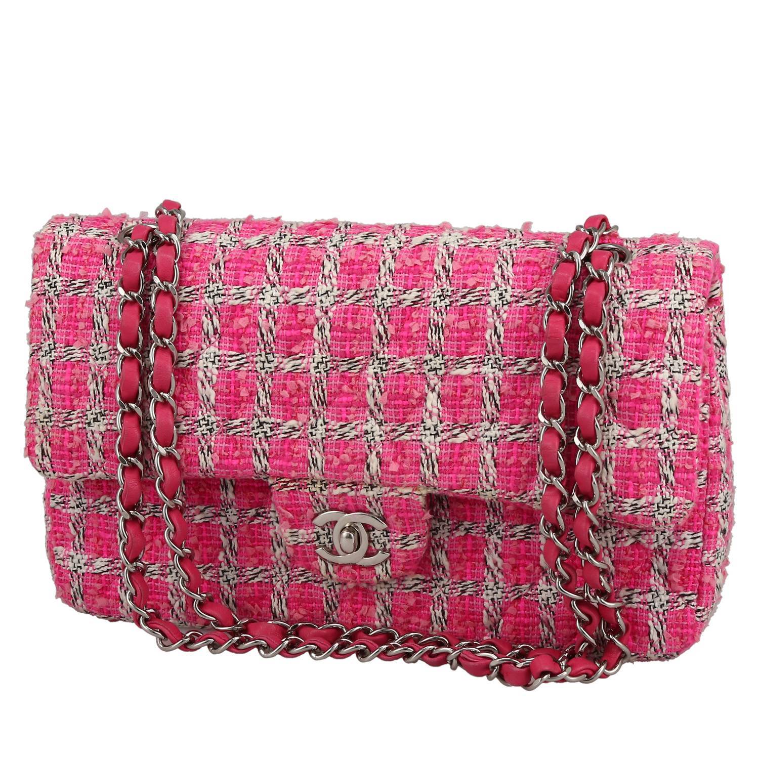 Magnífico bolso de mano Chanel Timeless Classic de tweed rosa diseño de cuadros, adorno en metal plateado, una asa en cadena de metal plateado entrelazada de cuero rosa para llevar en la mano o al hombro.