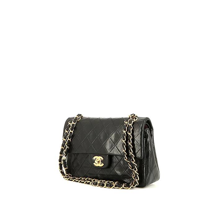 Intemporal bolso de mano Chanel Timeless de cuero acolchado negro, adorno en metal dorado, una asa en cadena ajustable de metal dorado entrelazada de cuero negro.