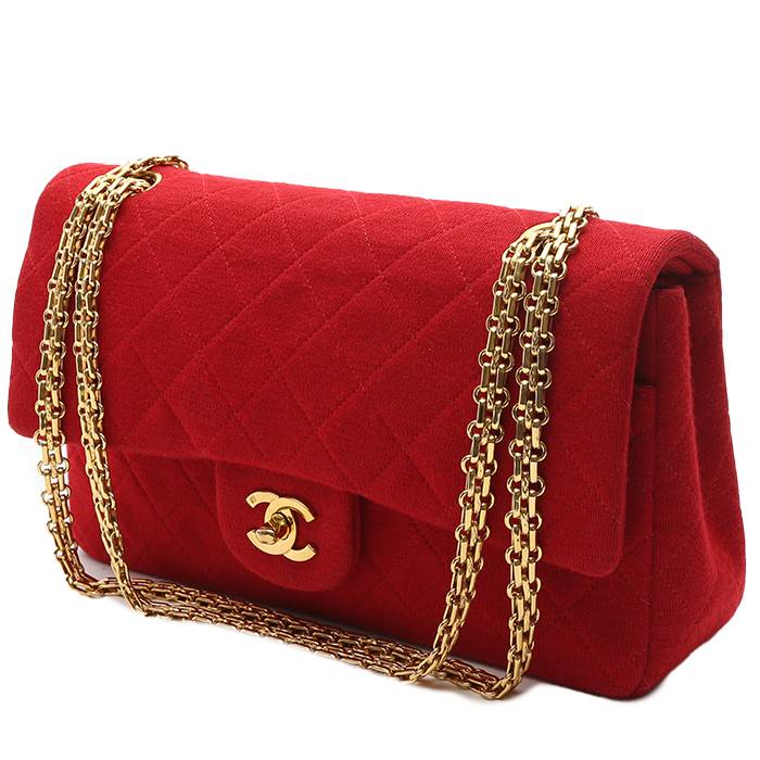 Elegante bolso de mano Chanel Timeless de jersey acolchado rojo, adorno en metal dorado, una asa en cadena de metal dorado para llevar en la mano o al hombro.