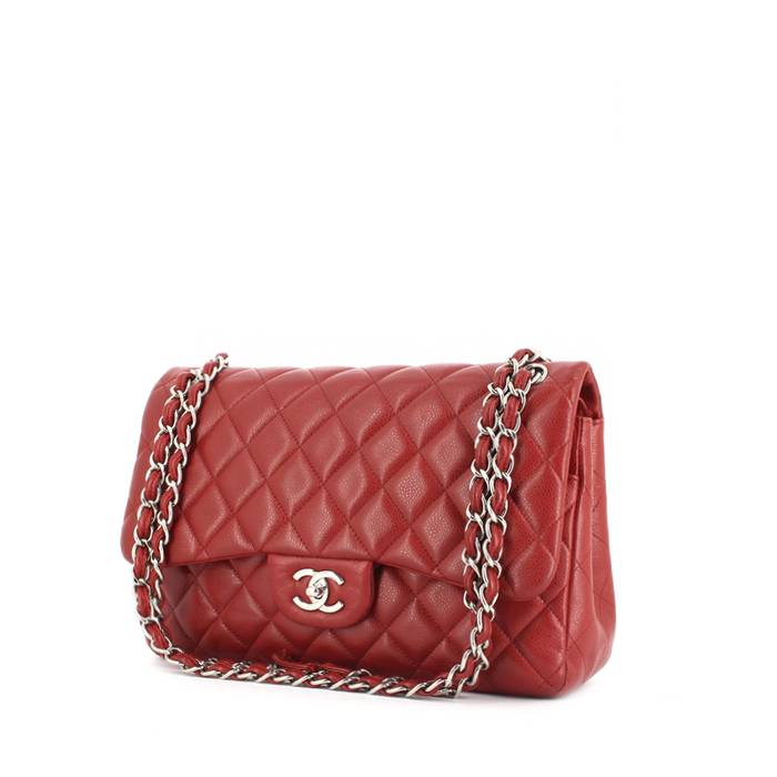 Magnífico bolso de mano "Timeless jumbo" de cuero acolchado rojo, adorno en metal plateado, asa en cadena de metal plateado entrelazada de cuero rojo para llevar en la mano o colgado al hombro o cruzado.
