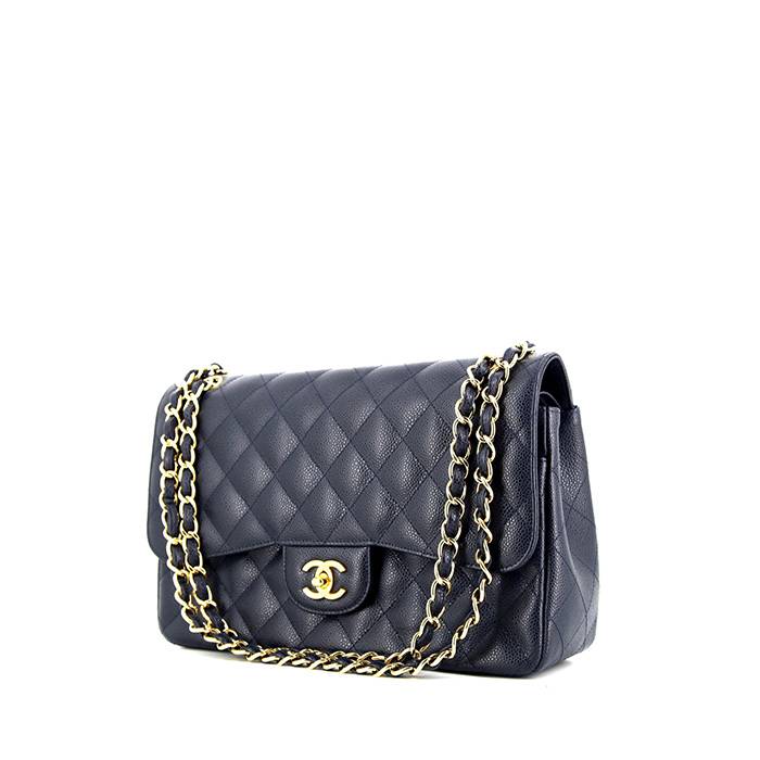 Elegante bolso de mano Chanel Timeless jumbo de cuero granulado acolchado azul marino, adorno en metal dorado, asa en cadena de metal dorado entrelazada de cuero azul marino para llevar en la mano o al hombro.