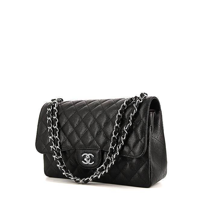 Famoso bolso de mano Chanel Timeless jumbo de cuero granulado acolchado negro, adorno en metal plateado, una asa en cadena de metal plateado entrelazada de cuero negro para llevar en la mano o al hombro.