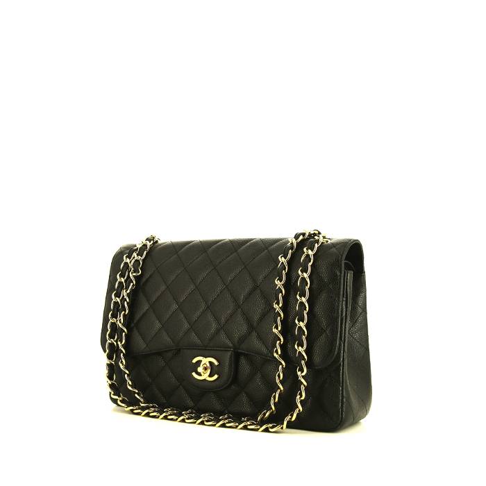 Clásico bolso de mano Chanel Timeless jumbo de cuero granulado acolchado negro, adorno en metal dorado, asa en cadena de metal dorado entrelazada de cuero negro para llevar en la mano o colgado al hombro o cruzado.