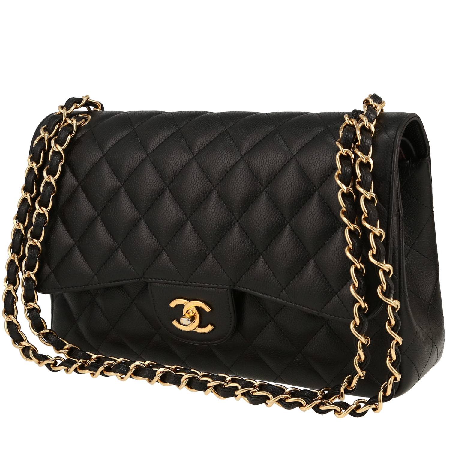 Espléndido bolso de mano Chanel Timeless Jumbo de cuero granulado acolchado negro, adorno en metal dorado, una asa en cadena de metal dorado entrelazada de cuero negro para llevar en la mano o colgado al hombro o cruzado.