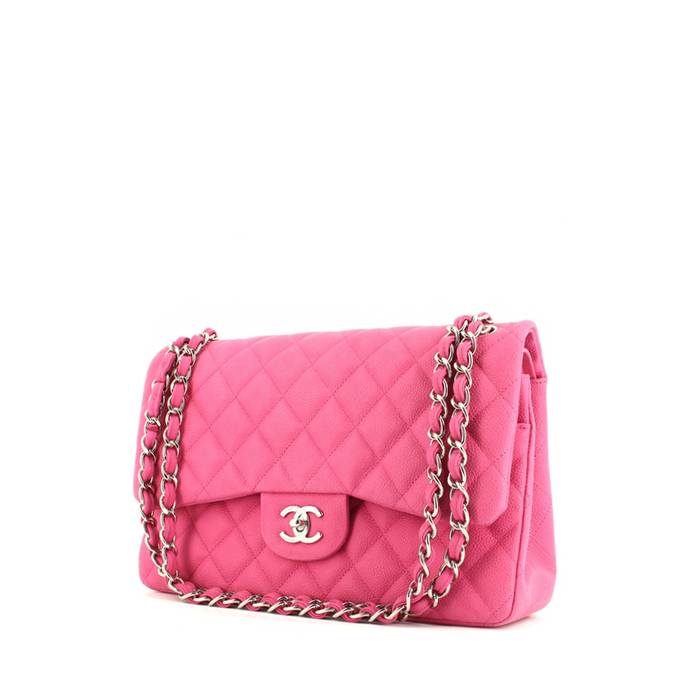 Magnífico bolso de mano "Timeless jumbo" de cuero granulado acolchado rosa, adorno en metal plateado, asa en cadena de metal plateado entrelazada de cuero rosa para llevar en la mano o al hombro.