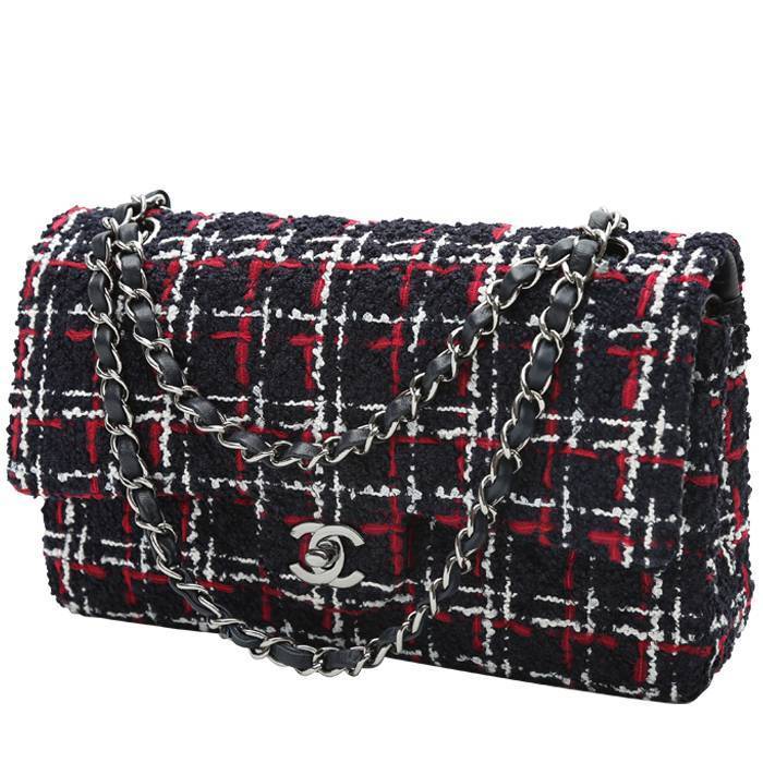 Elegante bolso bandolera Chanel Timeless de tweed azul y rojo, adorno en metal plateado, una asa en cadena de metal plateado entrelazada de cuero azul para llevar en la mano o colgado al hombro o cruzado.