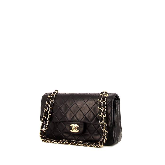 Delicado bolso de mano Chanel Timeless pequeño de cuero acolchado azul oscuro, adorno en metal dorado, asa en cadena de metal dorado entrelazada de cuero azul oscuro para llevar en la mano o al hombro.