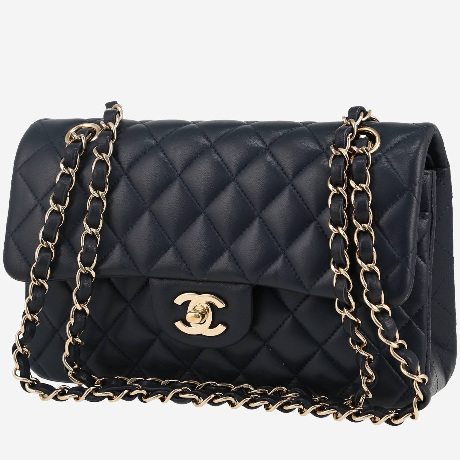 Precioso bolso de mano Chanel Timeless Petit de cuero acolchado azul marino, adorno en metal dorado, una asa en cadena ajustable de metal dorado entrelazada de cuero azul marino para llevar en la mano o al hombro.