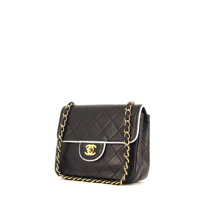 Encantador bolso de mano "Timeless" modelo pequeño de cuero acolchado negro y de junco blanco, adorno en metal dorado, asa en cadena de metal dorado entrelazada de cuero negro para llevar en la mano o colgado al hombro o cruzado.