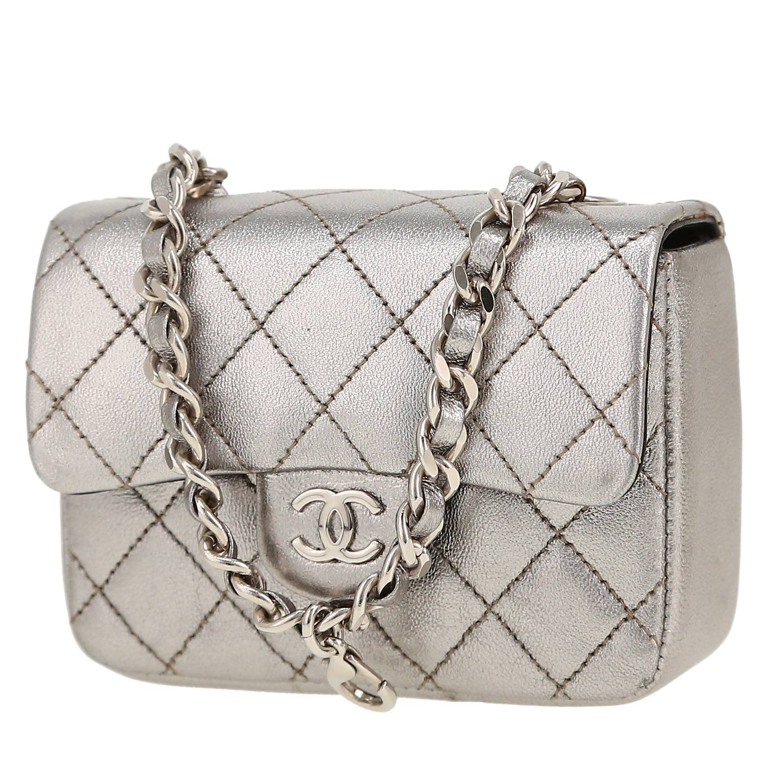 Magnífico llavero Chanel Timeless Extra Mini de cuero acolchado plateado, adorno en metal plateado, una asa en cadena de metal plateado entrelazada de cuero plateado para llevar en la mano.