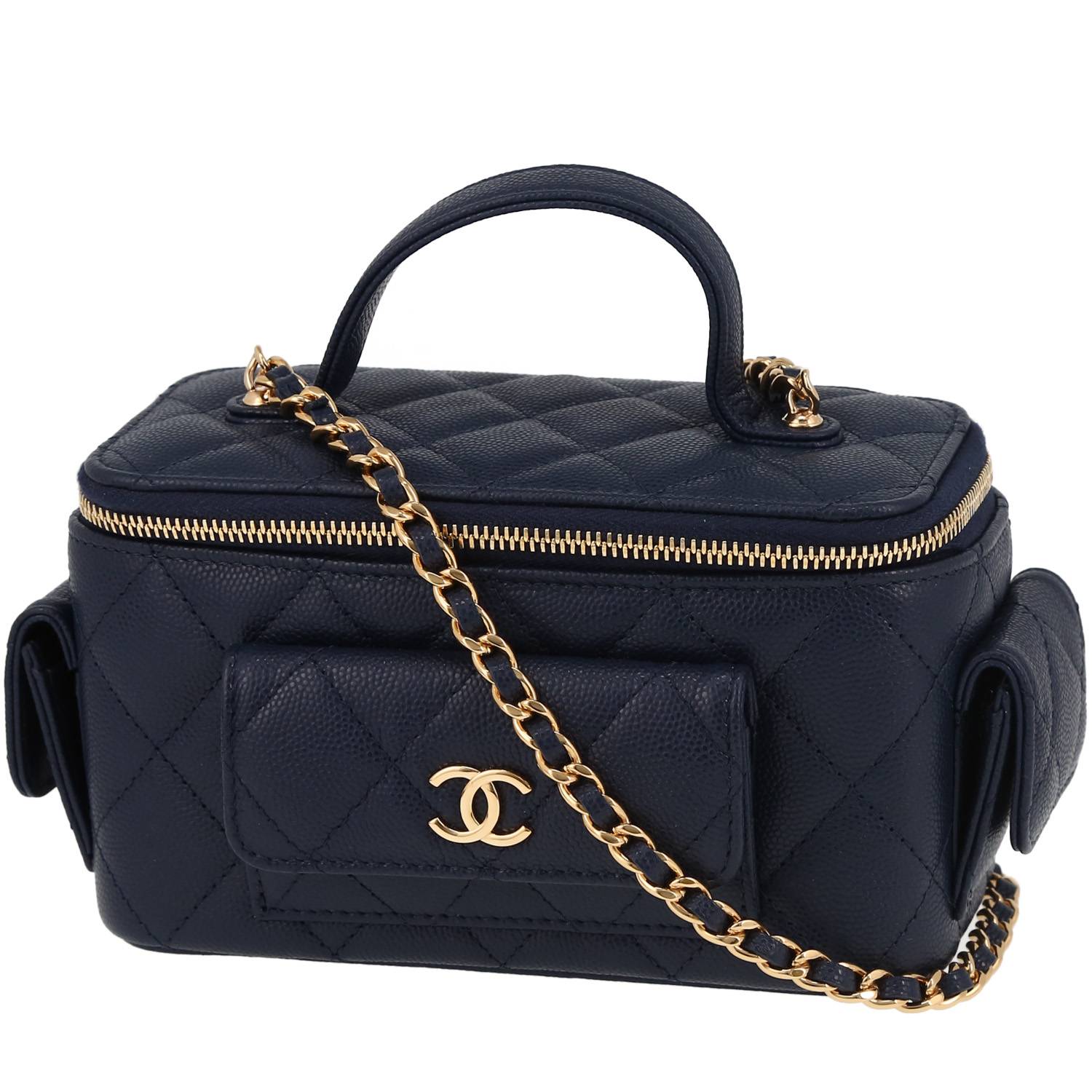Magnífico bolso/bolsito Chanel Chanel Vanity - Pocket Hand de cuero granulado azul marino, adorno en metal dorado, asa sencilla de cuero granulado azul marino, una asa en cadena de metal dorado entrelazada de cuero azul marino para llevar en la mano o colgado al hombro o cruzado.