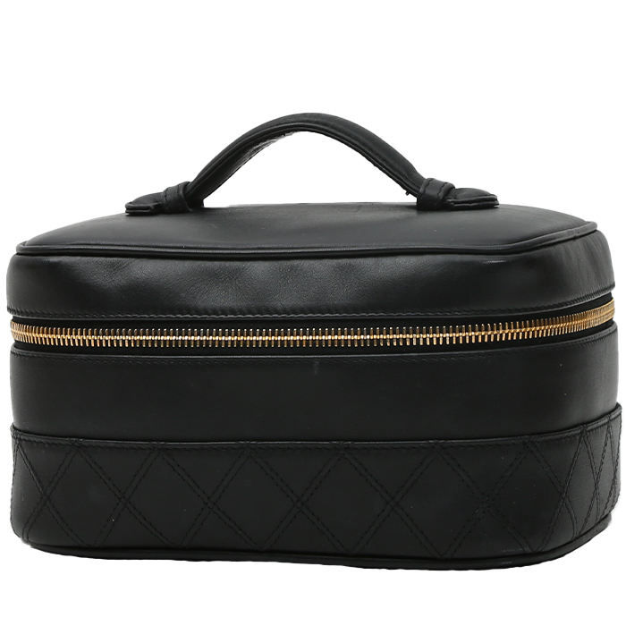 Elegante vanity Chanel Vanity de cuero negro, adorno en metal dorado, asa de cuero negro para llevar en la mano.