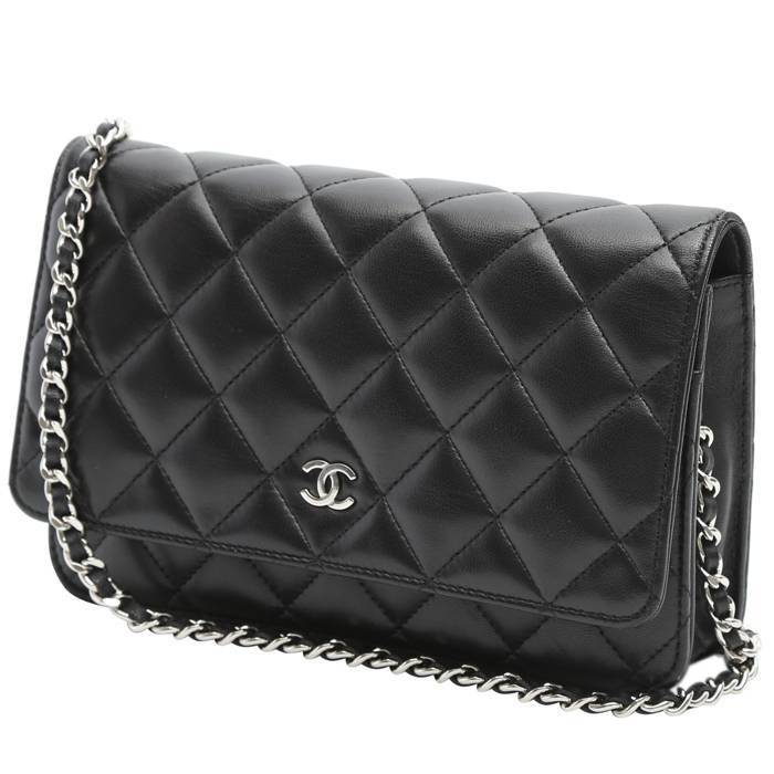 Bolso bandolera Chanel Wallet on Chain de cuero acolchado negro, adorno en metal plateado, una asa en cadena ajustable de metal plateado entrelazada de cuero negro para llevar en la mano o colgado al hombro o cruzado.