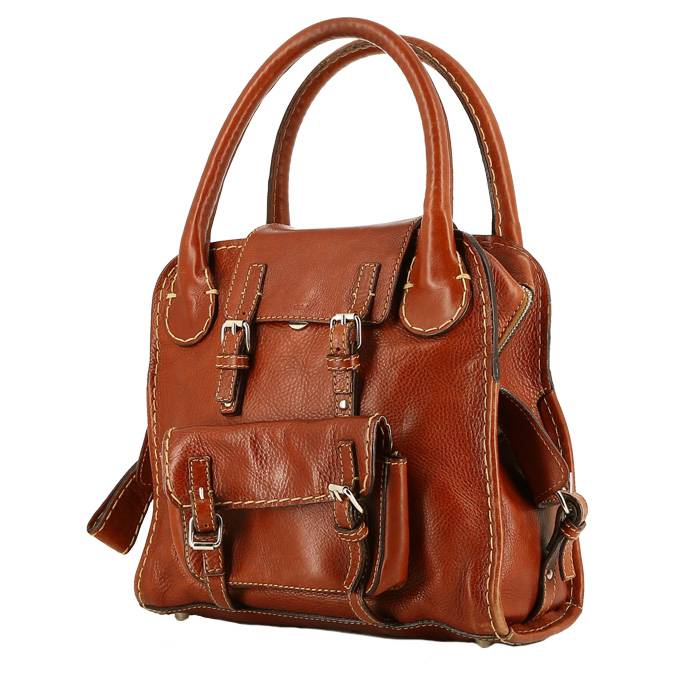 Bolso de mano Chloé Edith de cuero marrón, adorno en metal plateado, sobrecosturas blancas, doble asa redonda de cuero marrón.