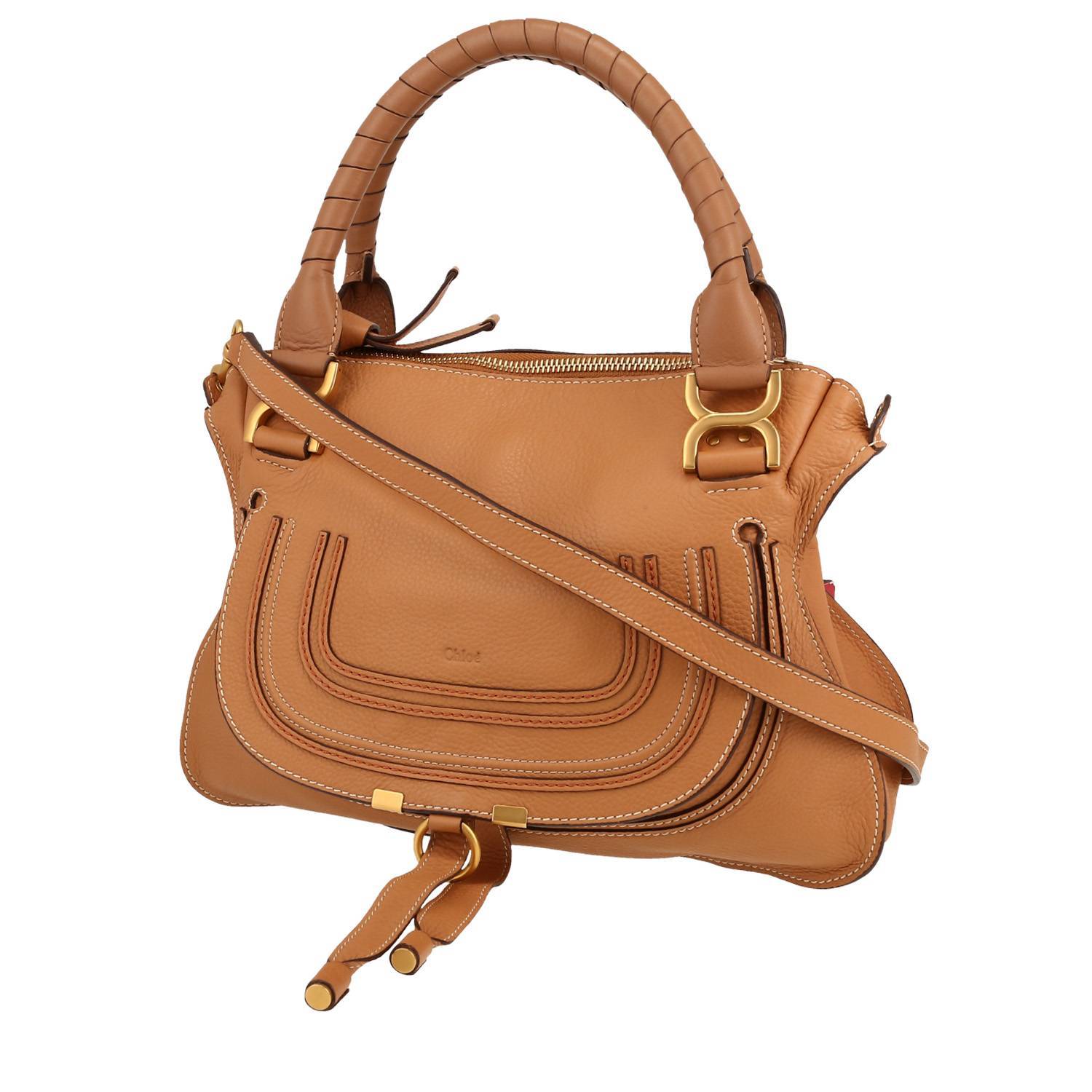 Bonito bolso de mano Chloé Marcie de cuero marrón, adorno en metal dorado, sobrecosturas blancas, doble asa de cuero marrón, una bandolera extraíble de cuero marrón para llevar en la mano o colgado al hombro o cruzado.