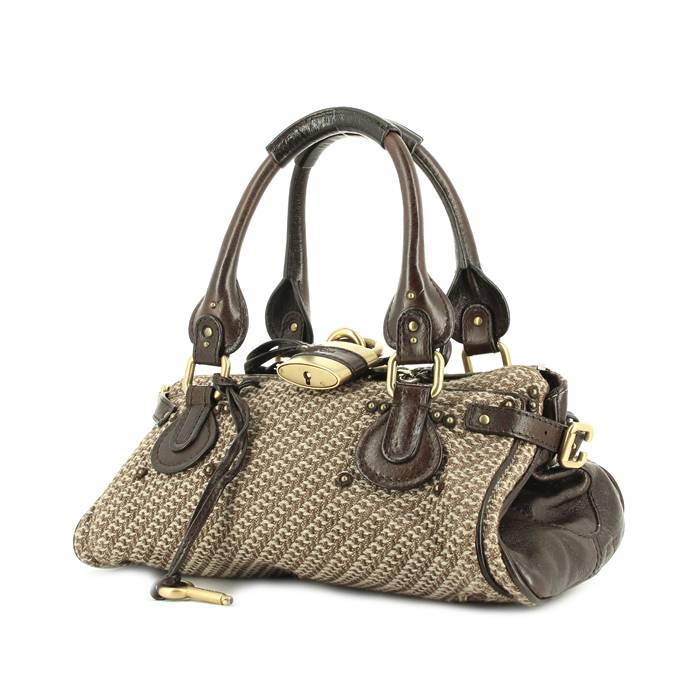 Bolso de mano de lona y de cuero marrón, adorno de metal dorado, doble asa de cuero marrón para llevar en la mano o al hombro.