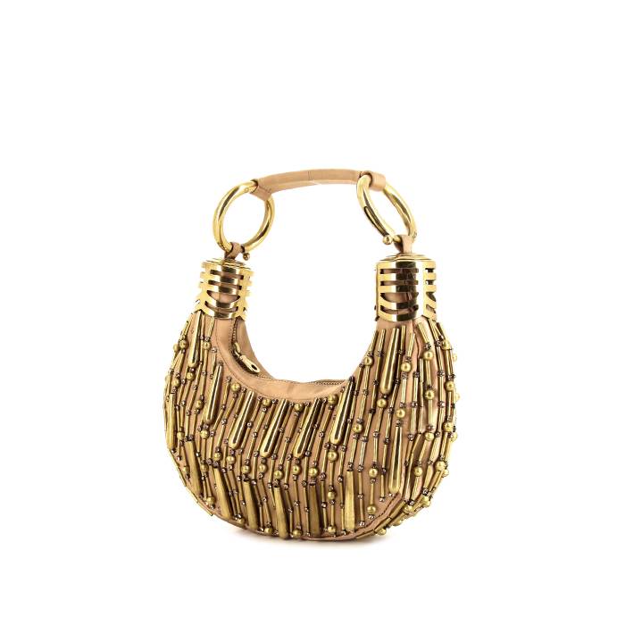 Bonito y original bolso de mano Chloé Vintage de satén beige con diseños geométricos, adorno en metal dorado, asa de tela beige para llevar en la mano o al hombro.