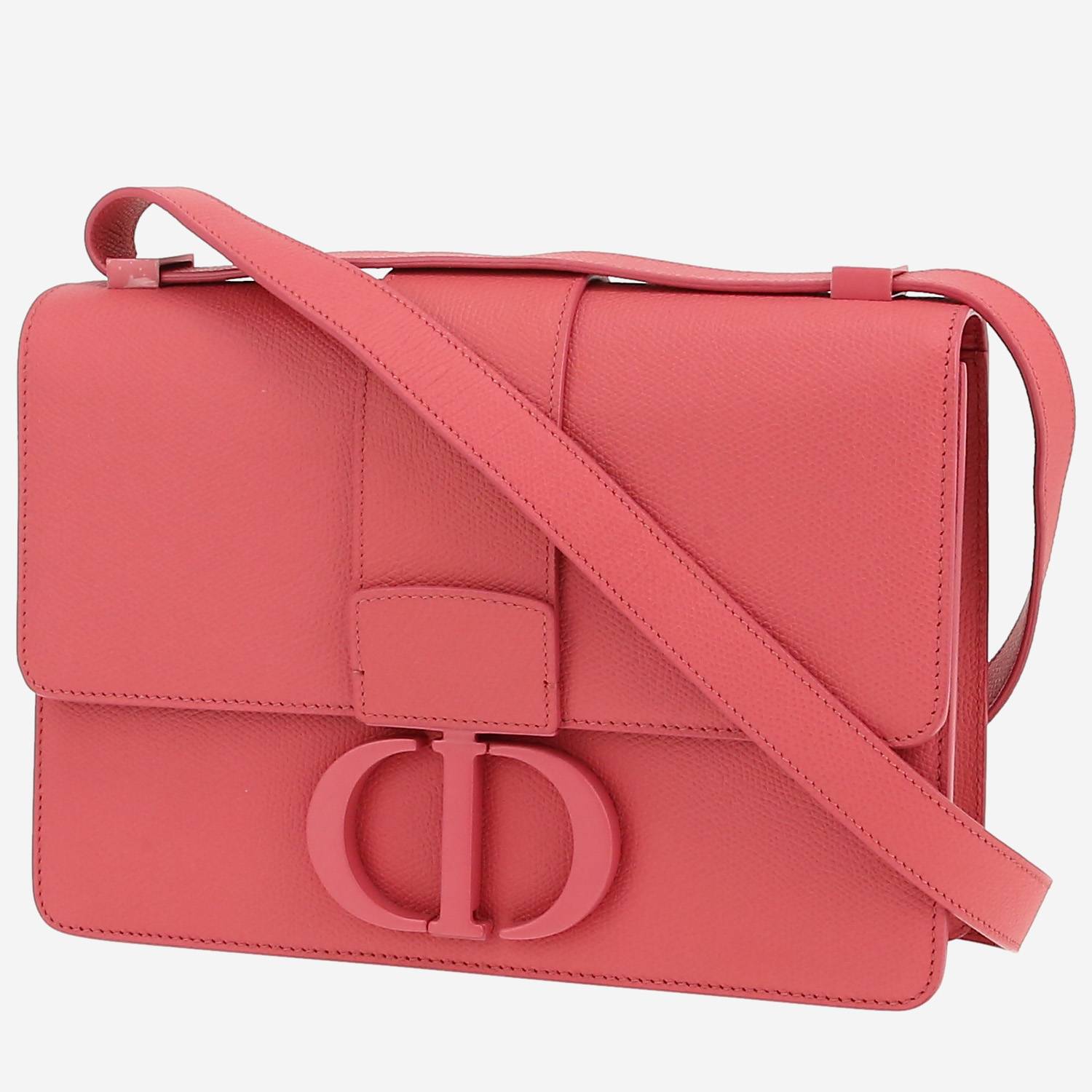 Elegante bolso bandolera Dior 30 Montaigne de cuero granulado rosa, una bandolera ajustable de cuero granulado rosa para llevar al hombro o cruzado.