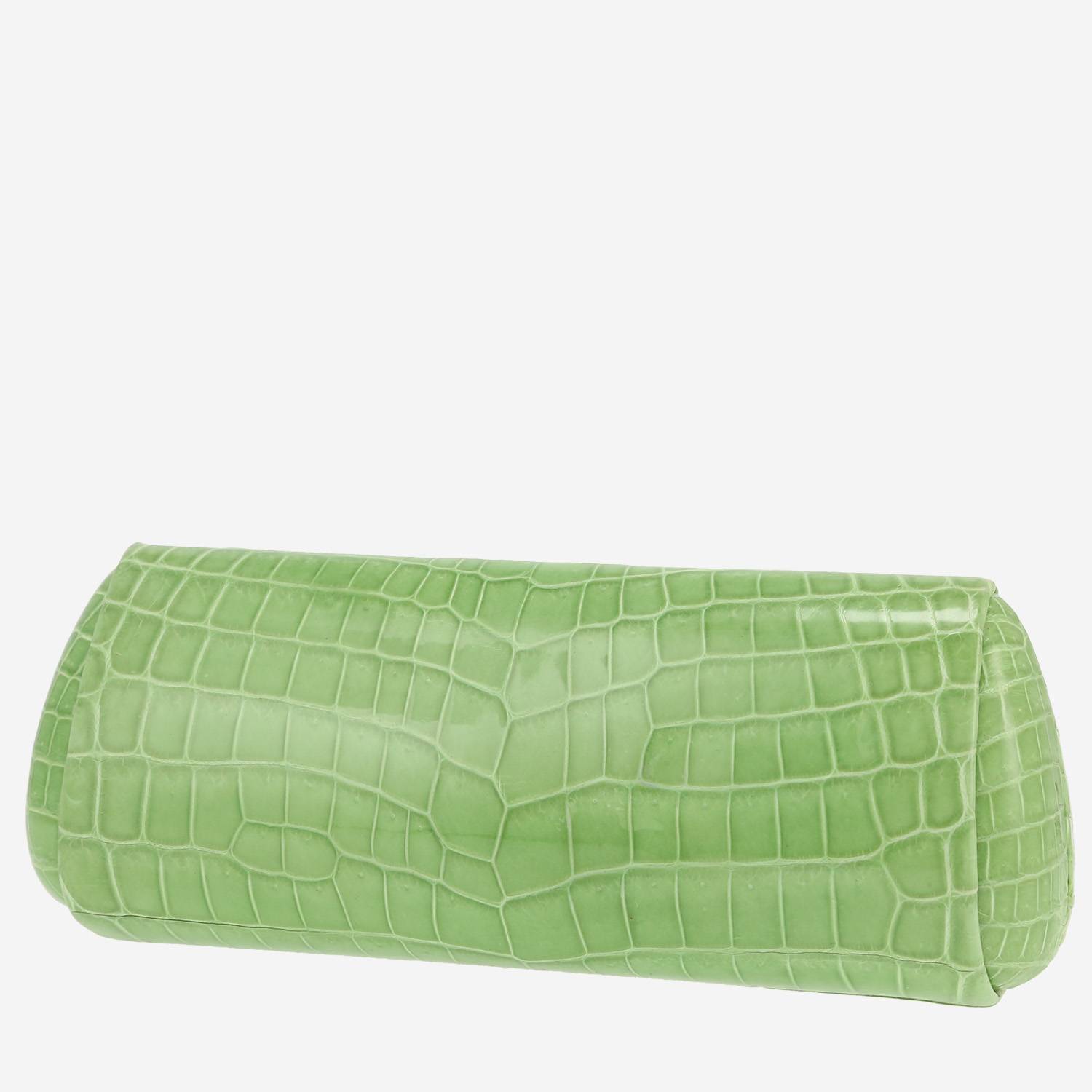 Excepcional bolsito de mano Dior de cocodrilo verde, adorno en metal plateado.