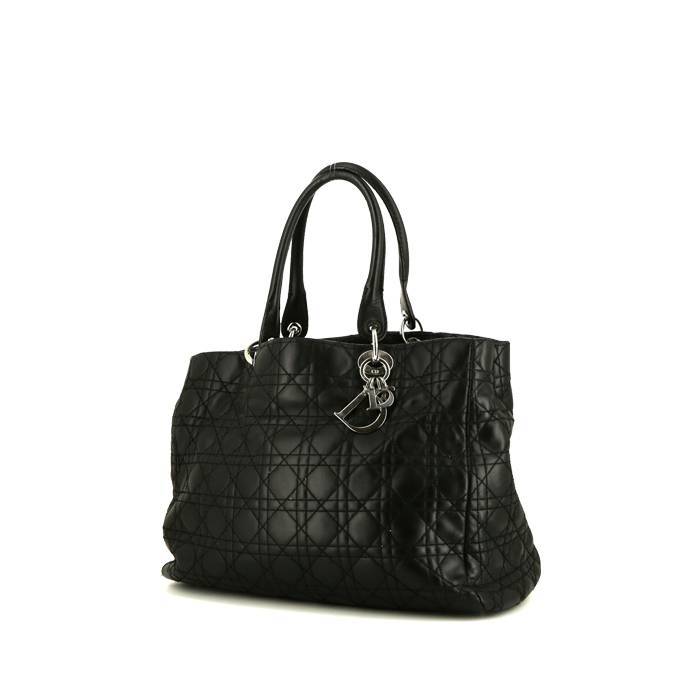 Práctico bolso Cabás Dior Cannage de cuero acolchado negro cannage, adorno en metal plateado, dos asas de cuero negro para llevar en la mano o al hombro.
