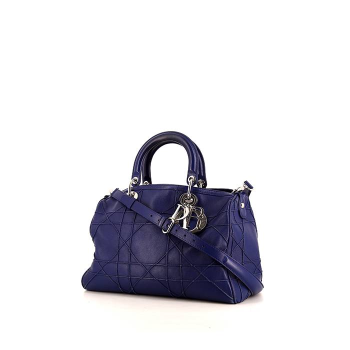 Excepcional bolso de mano Dior Granville Polochon de cuero cannage azul eléctrico, adorno en metal plateado, doble asa de cuero azul, bandolera extraíble y ajustable de cuero azul para llevar en la mano o al hombro.