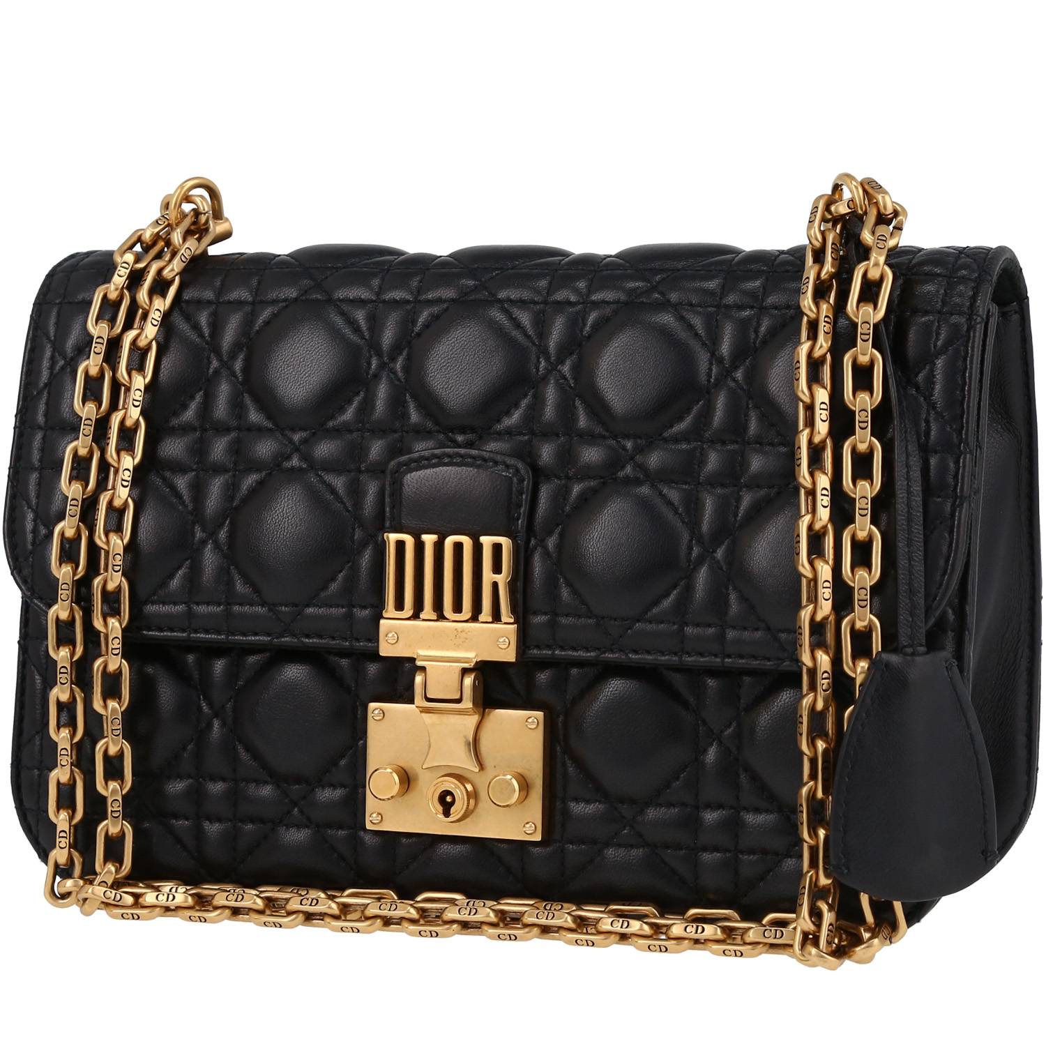 Magnífico bolso bandolera Dior Dioraddict de cuero cannage negro, adorno en metal dorado, una asa en cadena ajustable de metal dorado para llevar al hombro o cruzado.