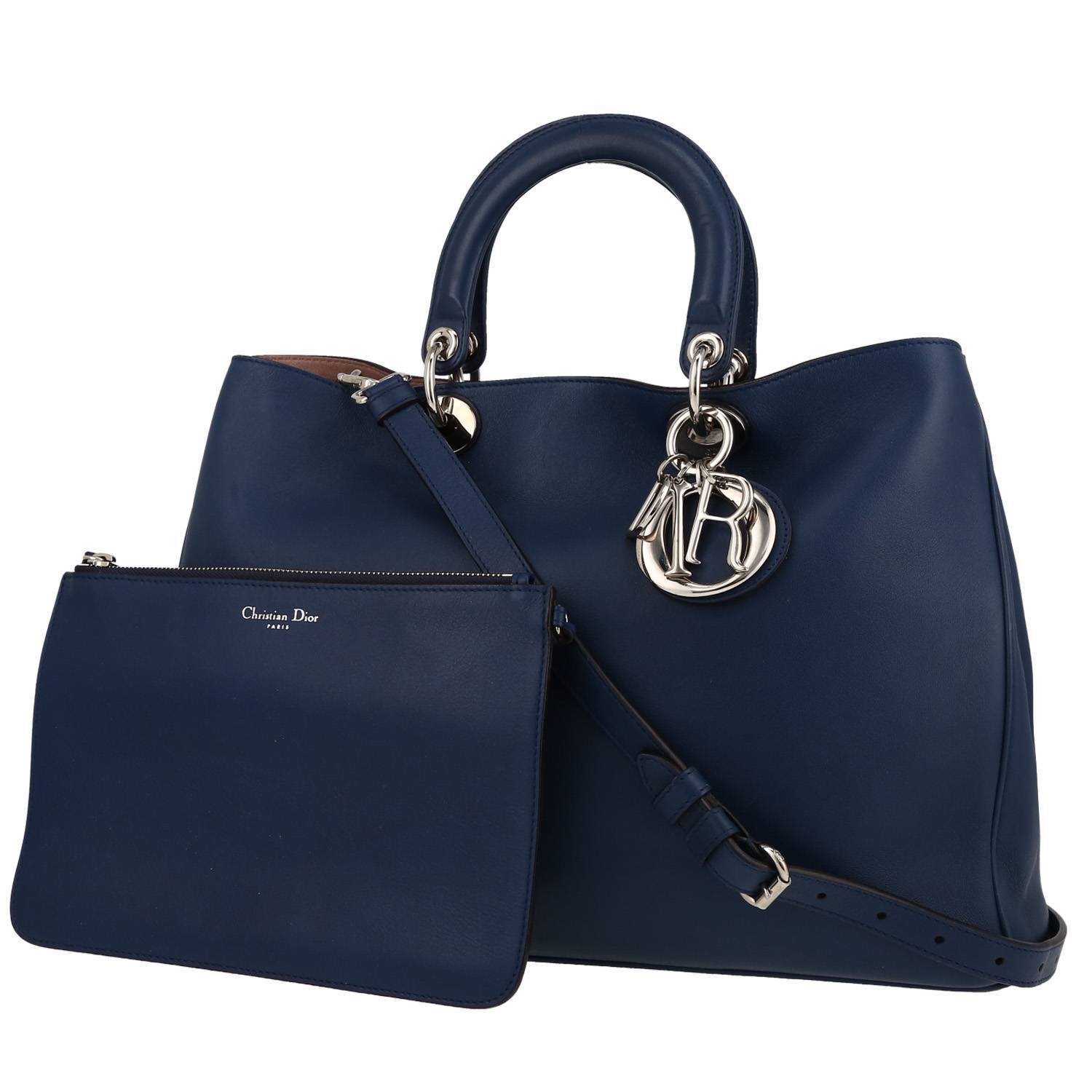 Práctico bolso de mano Dior Diorissimo de cuero azul, adorno en metal plateado, doble asa de cuero azul, una asa extraíble y ajustable de cuero azul para llevar en la mano o al hombro.