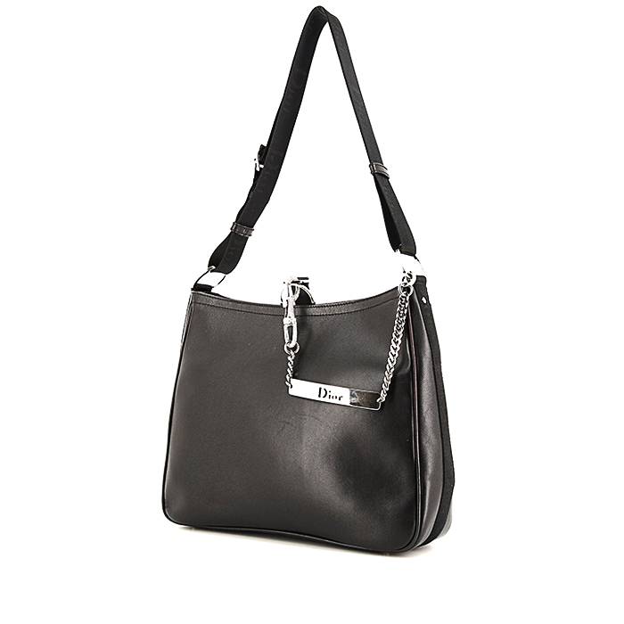 Elegante bolso de mano Dior Hardcore de lona revestida negra y de cuero negro, adorno en metal plateado, una asa ajustable de lona negra para llevar al hombro.