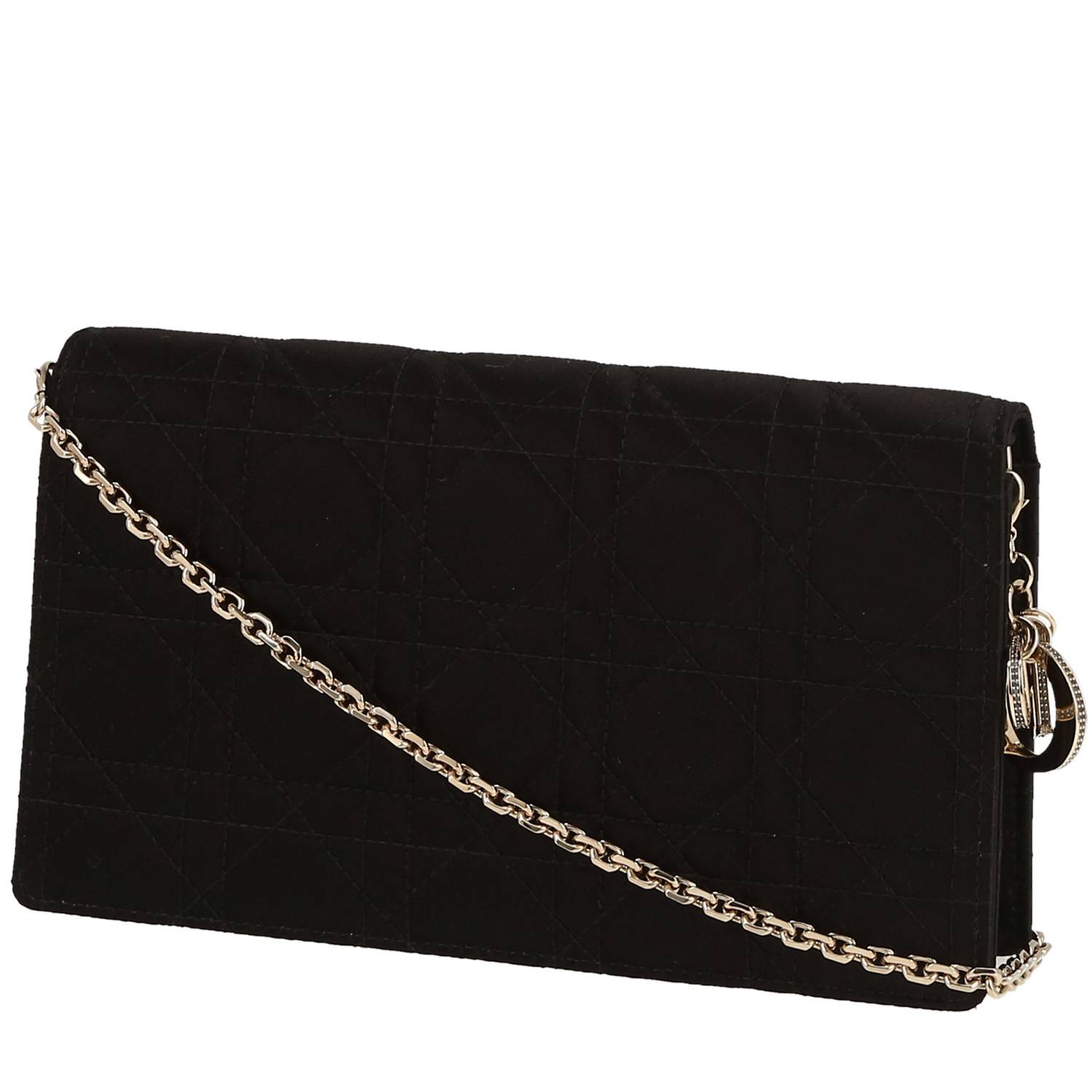 Encantador bolsito de mano Dior Lady Dior Rendez-vous de satén negro cannage, adorno en metal dorado, una asa en cadena extraíble de metal dorado para llevar en la mano o colgado al hombro o cruzado.