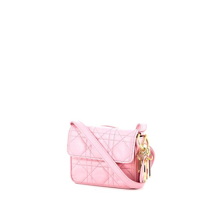 Divertido bolsito de mano Dior Mini Lady Dior de cuero cannage rosa, adorno en metal dorado, bandolera de cuero rosa para llevar al hombro o cruzado.