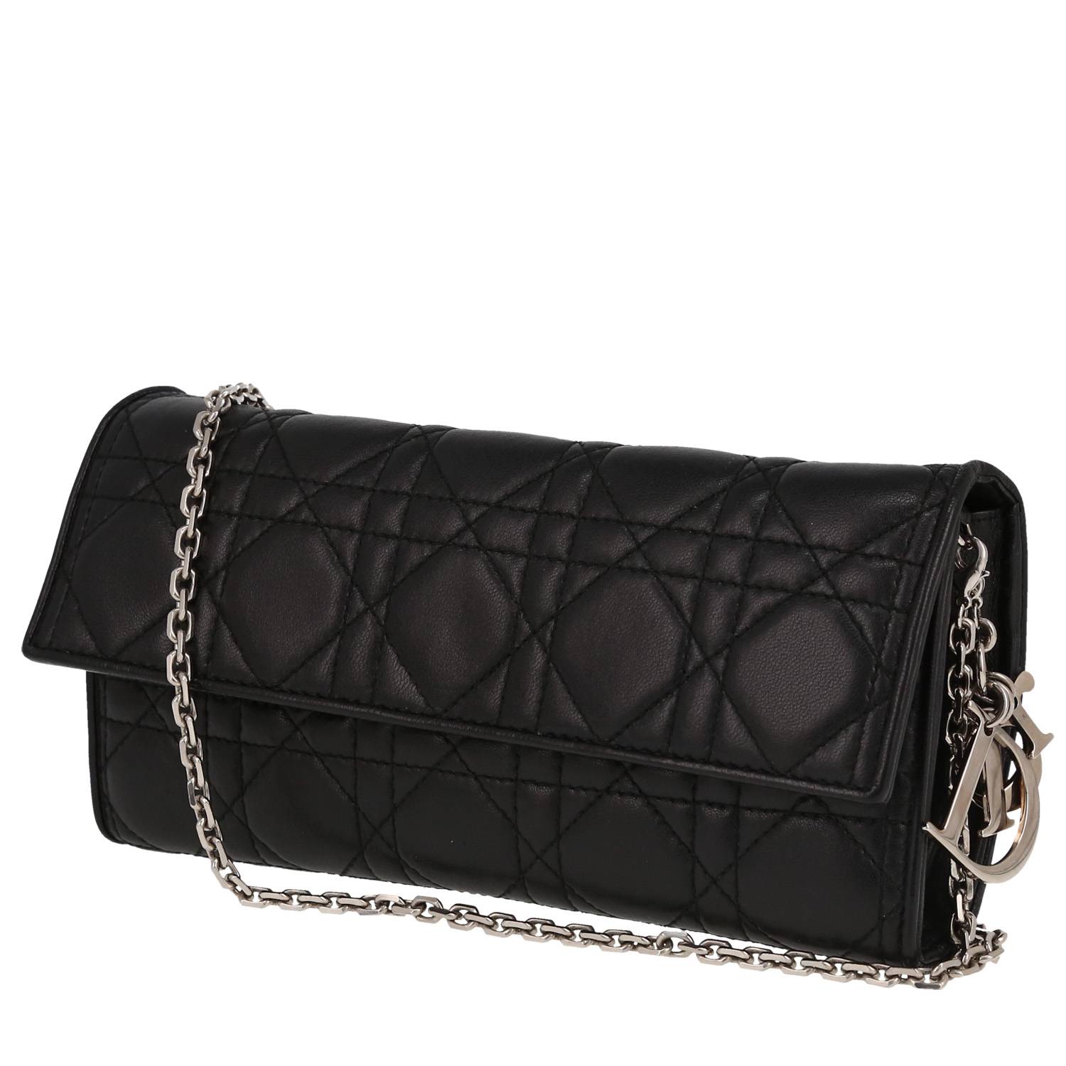Magnífico bolso bandolera Dior Lady Dior Wallet on Chain de cuero cannage negro, adorno en metal plateado, una asa en cadena extraíble de metal plateado para llevar en la mano o colgado al hombro o cruzado.
