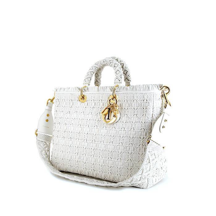 Delicado bolso Cabás Dior Lady Dior modelo grande de cuero trenzado blanco, adorno en metal dorado, doble asa de cuero blanco, bandolera extraíble de cuero blanco para llevar en la mano o colgado al hombro o cruzado.