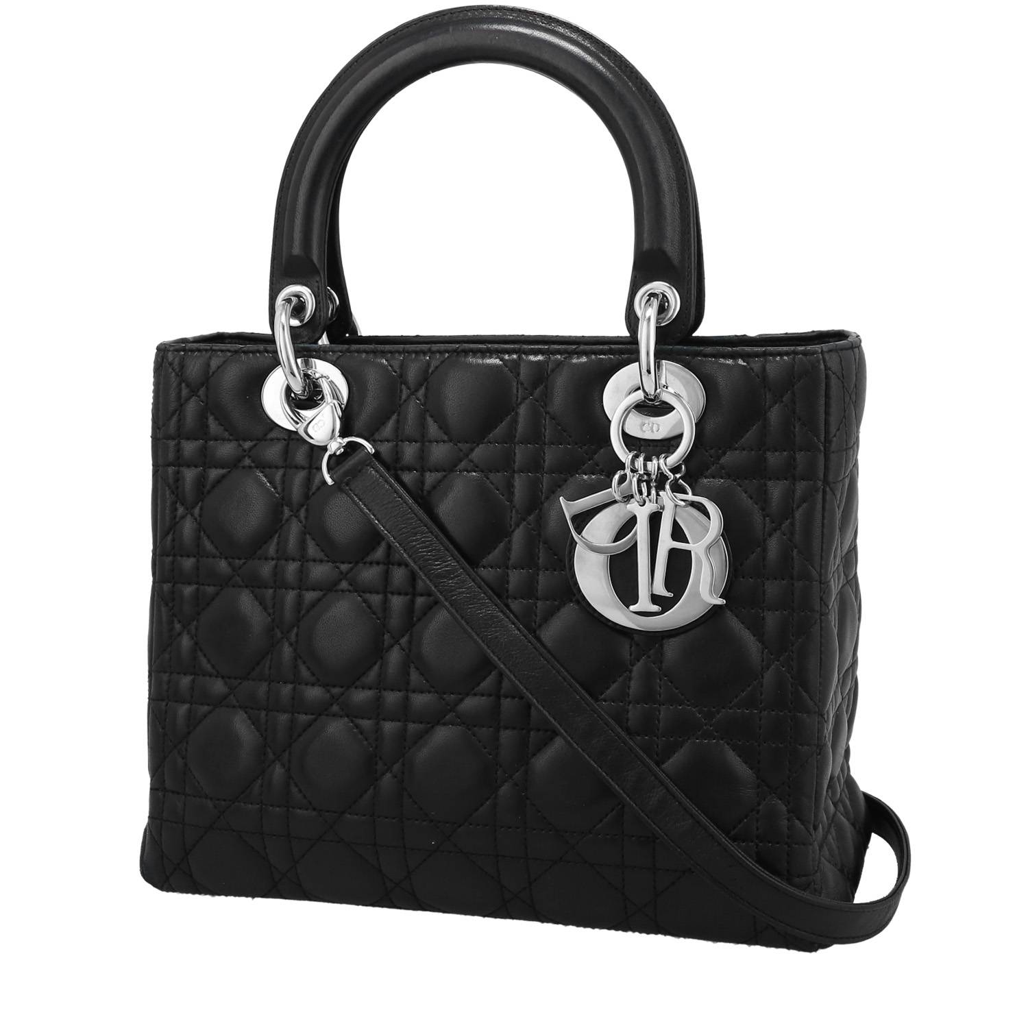 Inconfundible bolso de mano Dior Lady Dior de cuero cannage negro, adorno en metal plateado, doble asa de cuero negro, bandolera extraíble de cuero negro para llevar en la mano o al hombro.