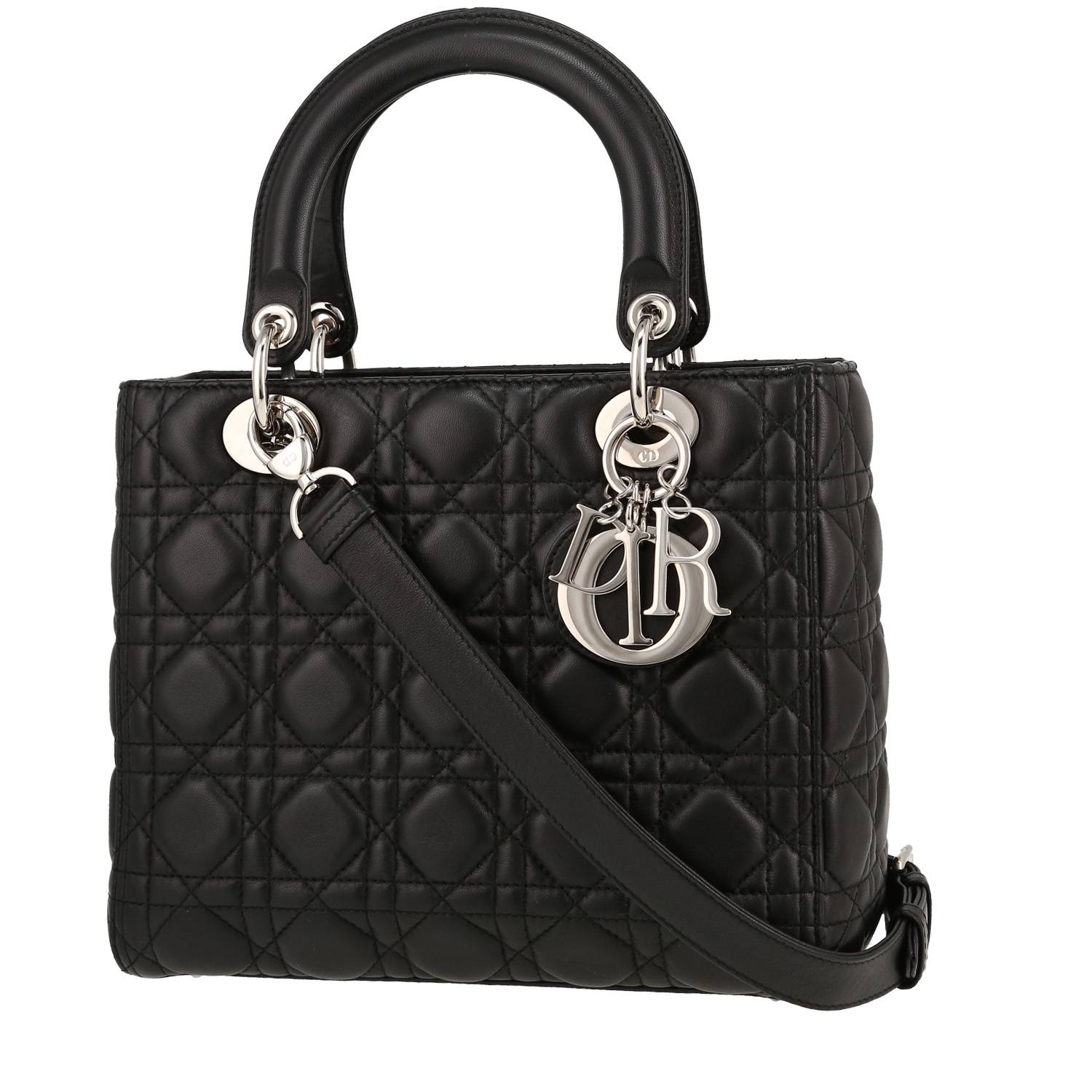 Inconfundible bolso de mano Dior Lady Dior de cuero cannage negro, adorno en metal plateado, doble asa de cuero negro, bandolera extraíble de cuero negro para llevar en la mano o colgado al hombro o cruzado.