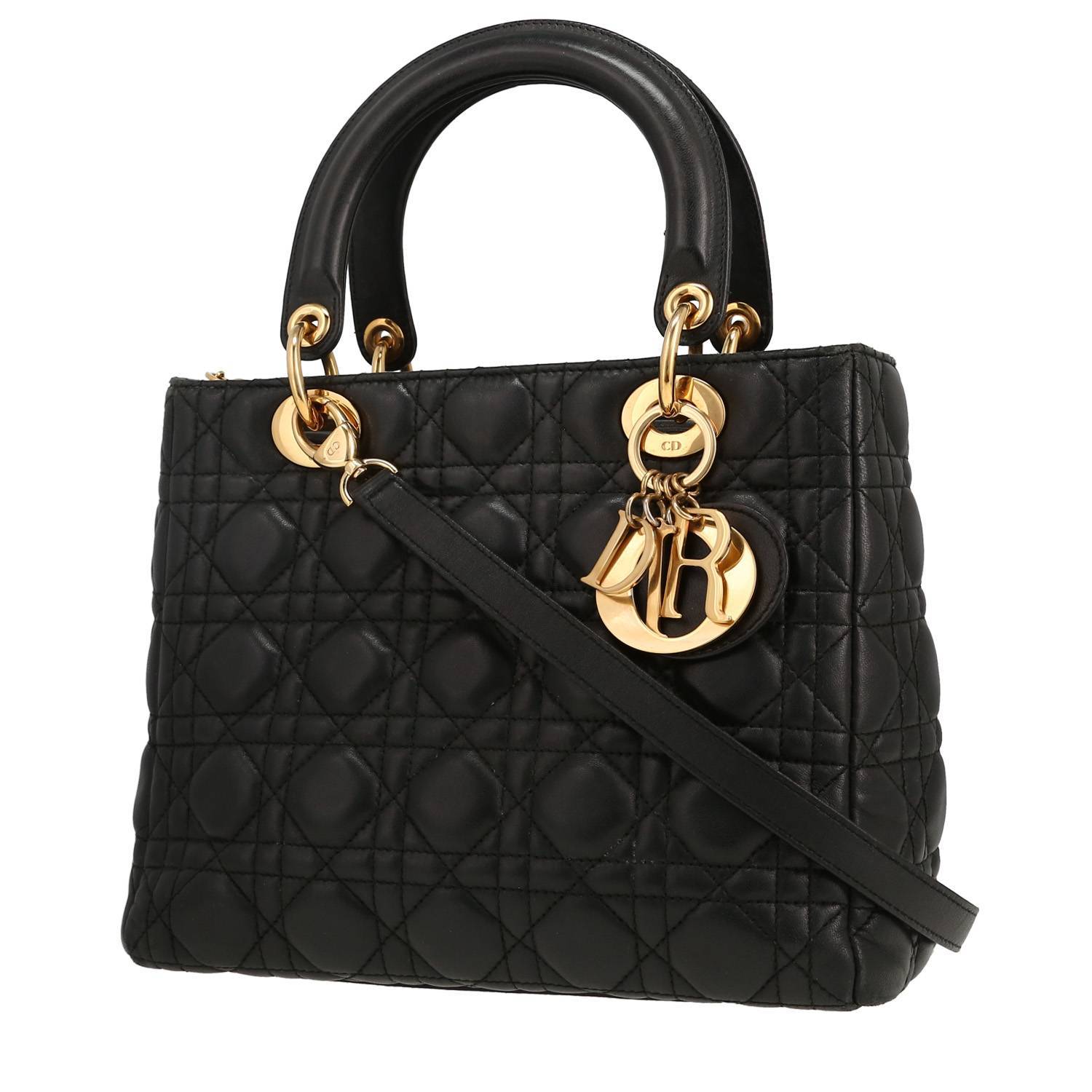 Inconfundible bolso de mano Dior Lady Dior de cuero cannage negro, adorno en metal dorado, doble asa de cuero negro, bandolera extraíble de cuero negro para llevar en la mano o al hombro.