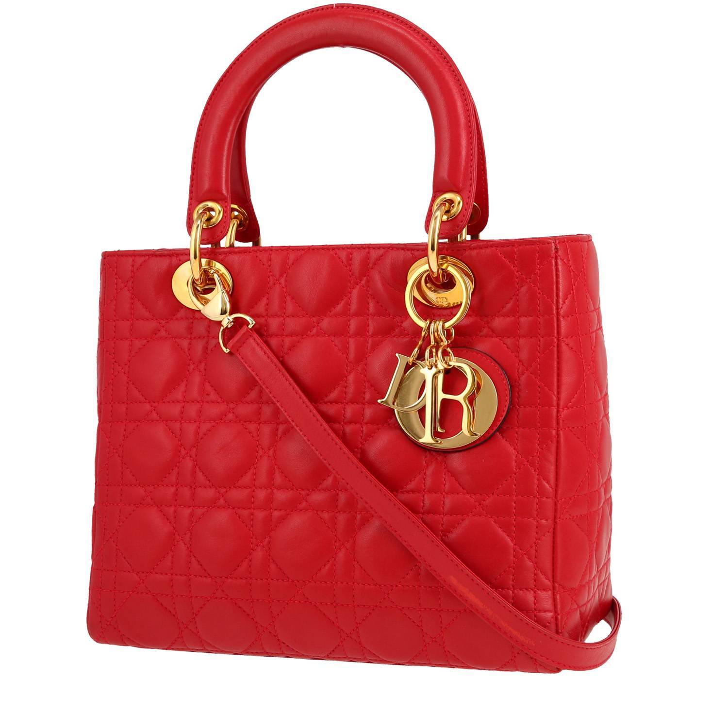 Inconfundible bolso de mano Dior Lady Dior de cuero cannage rojo, adorno en metal dorado, doble asa de cuero rojo, bandolera extraíble de cuero rojo para llevar en la mano o al hombro.