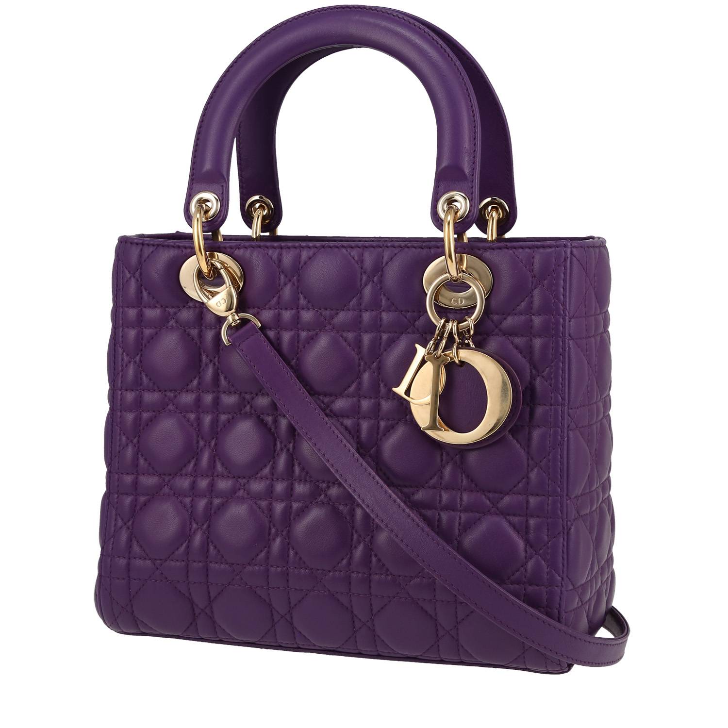 Magnífico bolso de mano Dior Lady Dior de cuero cannage violeta, adorno en metal dorado, doble asa de cuero violeta para llevar en la mano o al hombro.