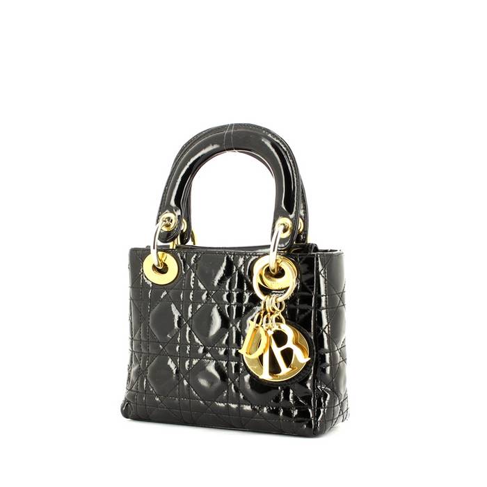 Bolso de mano "Lady Dior" mini de charol Monogram negro, adorno en metal dorado, doble asa de charol negro para llevar en la mano.