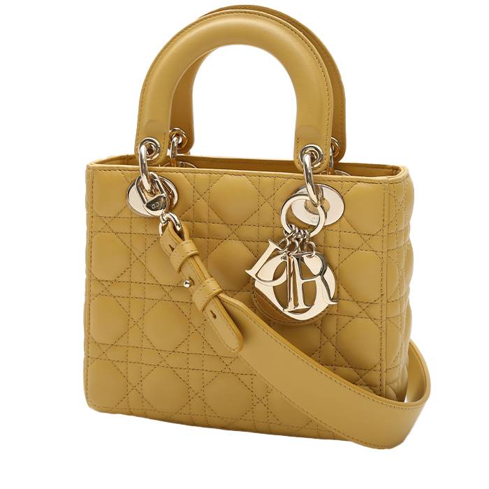 Magnífico bolso de mano Dior Lady Dior mini de cuero cannage amarillo, adorno en metal dorado, doble asa de cuero amarillo, bandolera extraíble de cuero amarillo para llevar en la mano o colgado al hombro o cruzado.