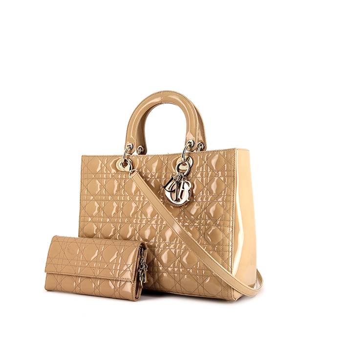 Bolso de mano Dior Lady Dior modelo grande de charol beige cannage, adorno en metal plateado, sobrecosturas beige, doble asa de charol beige, una delgada asa extraíble de cuero para llevar en la mano o al hombro.