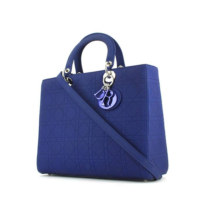 Famoso bolso de mano "Lady Dior" modelo grande de cuero azul real cannage, adorno en metal plateado, sobrecosturas azules, doble asa de cuero azul real, una bandolera extraíble para llevar en la mano o al hombro.