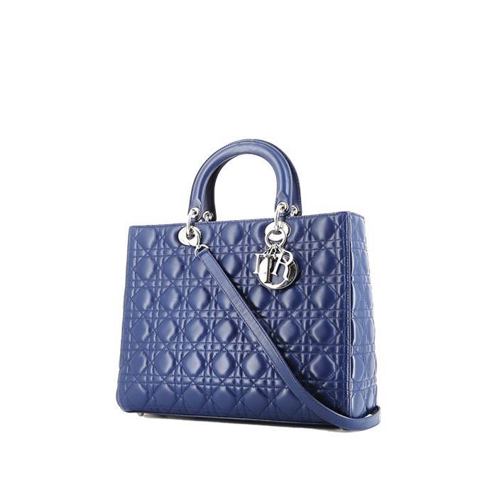 Precioso bolso de mano Dior Lady Dior modelo grande de cuero cannage azul, adorno en metal plateado, doble asa de cuero azul, bandolera extraíble de cuero azul para llevar en la mano o al hombro.