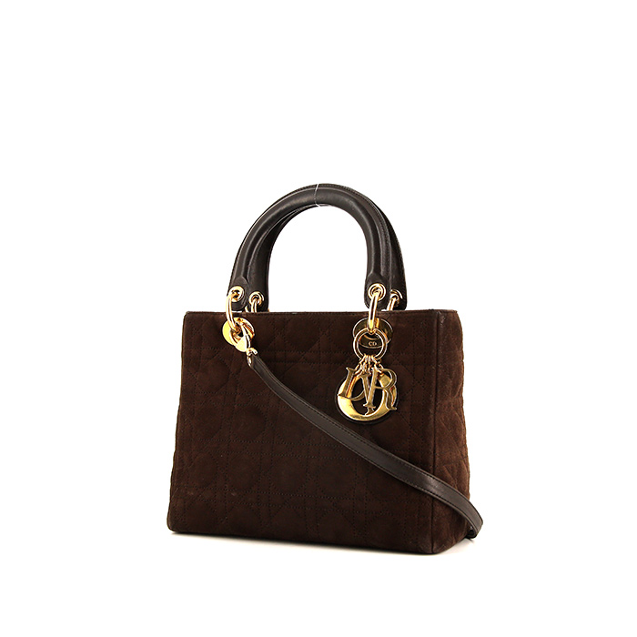 Bonito bolso de mano Dior Lady Dior modelo mediano de ante marrón cannage, adorno en metal dorado, doble asa de cuero marrón, bandolera extraíble de cuero marrón para llevar en la mano o colgado al hombro o cruzado.