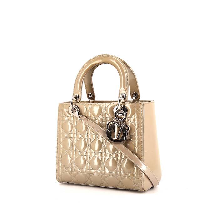 Bolso de mano Dior Lady Dior modelo mediano de charol beige cannage, adorno en metal plateado, sobrecosturas beige, doble asa de charol beige, bandolera ajustable de cuero beige para llevar en la mano o colgado al hombro o cruzado.
