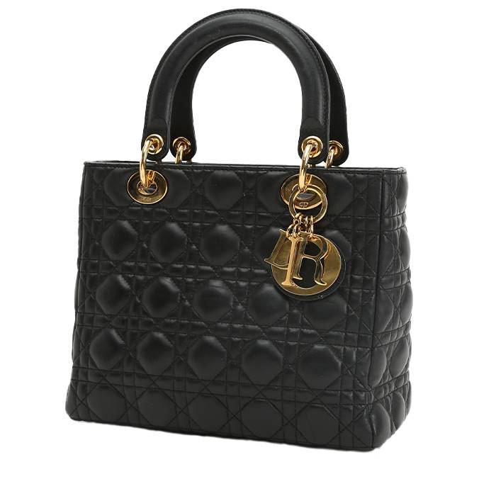 Encantador bolso de mano Dior Lady Dior modelo mediano de cuero cannage negro, adorno en metal dorado, doble asa de cuero negro para llevar en la mano.