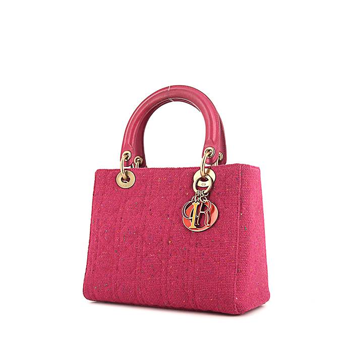 Elegante bolso de mano Dior Lady Dior modelo mediano de tweed rosa fucsia y de cuero rosa, adorno en metal dorado, doble asa de cuero rosa para llevar en la mano.