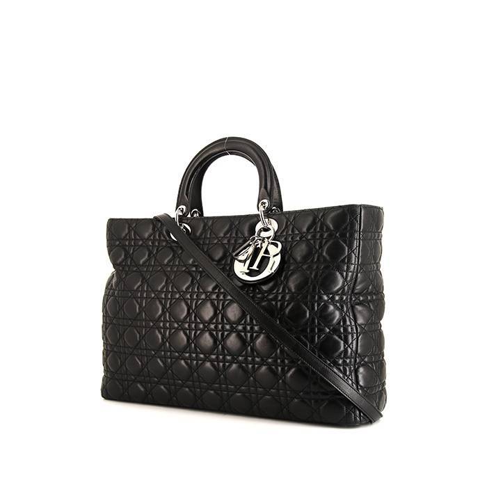 Magnífico bolso de mano Dior Lady Dior talla XL de cuero cannage negro, adorno en metal plateado, sobrecosturas negras, doble asa de cuero negro, bandolera extraíble de cuero negro para llevar en la mano o al hombro.