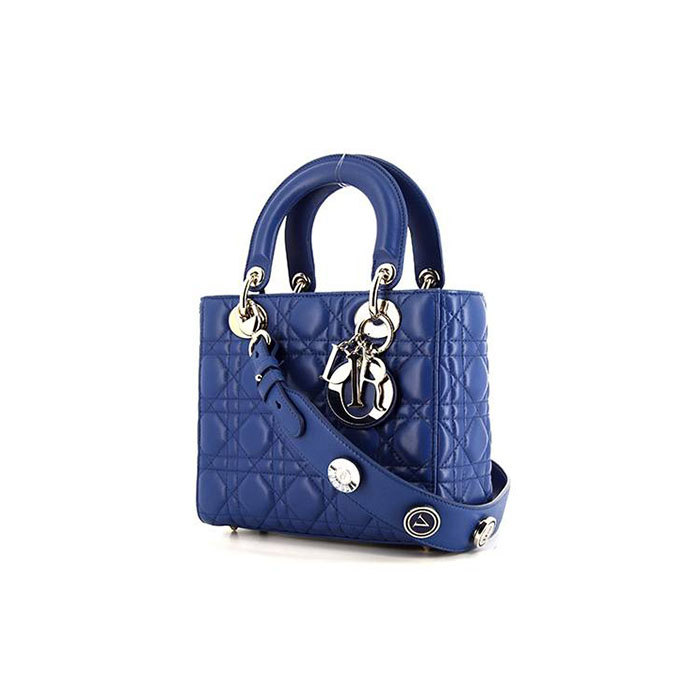 Encantador bolso de mano Dior My ABCDIOR modelo pequeño de cuero cannage azul, adorno en metal plateado, doble asa de cuero azul, bandolera extraíble y ajustable de cuero azul para llevar en la mano o colgado al hombro o cruzado.