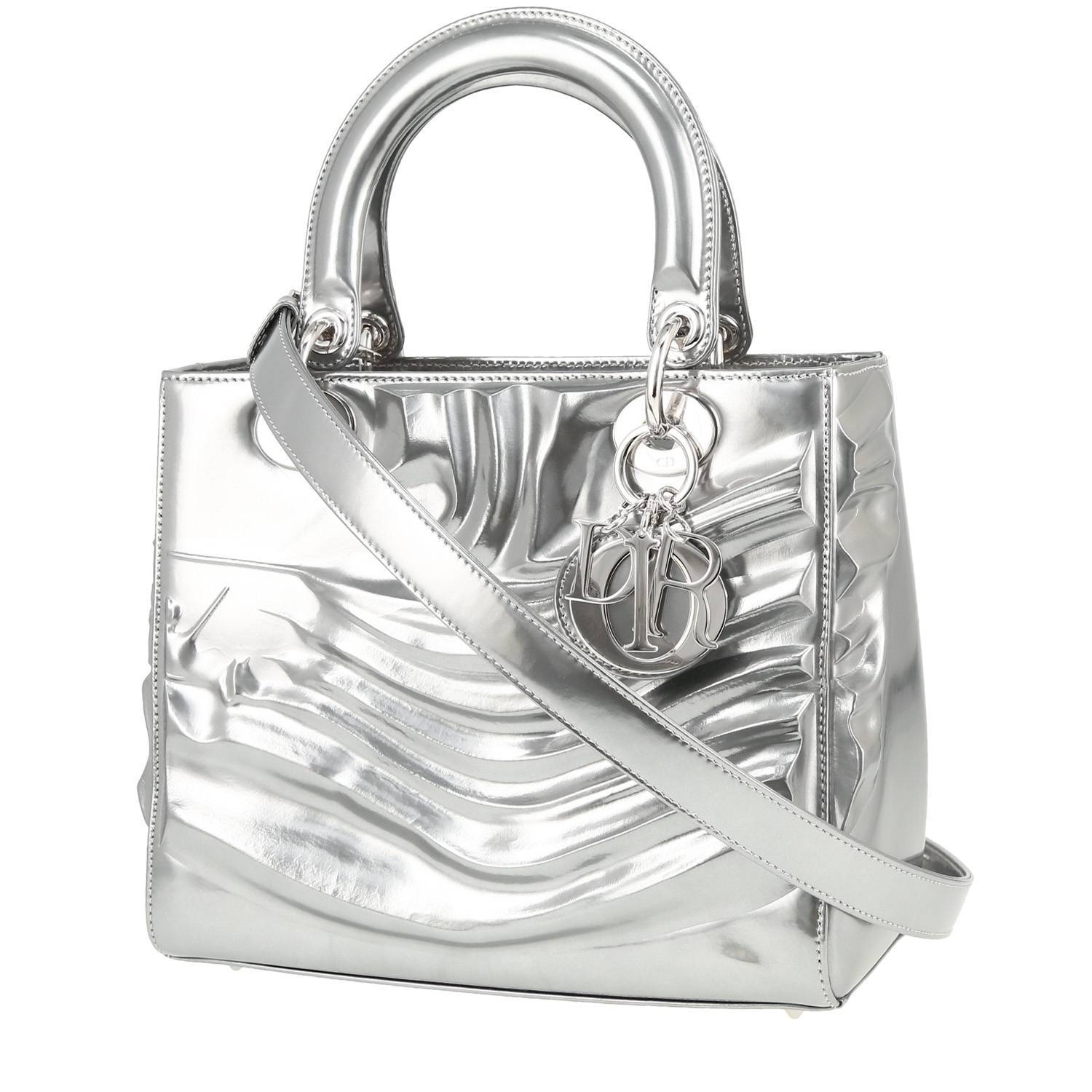 Muy poco común bolso de mano Dior Lady Dior Edition Limitée Jason Martin de cuero plateado estampado, adorno en metal plateado, doble asa de cuero plateado, bandolera extraíble de cuero plateado para llevar en la mano o colgado al hombro o cruzado.